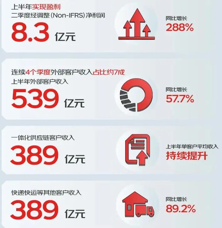 对于一体化供应链增势放缓,京东物流表示,这主要是因为外部一体化的单客户平均收入同比增长23.8%至24.7万元,上半年公司与快消、汽车等行业头部客户的合作规模不断扩大,合作的深度和黏性增强。