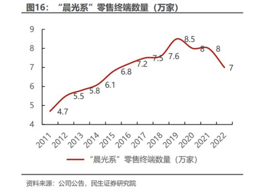 长期来看,晨光线下渠道已经趋近饱和,当初人口红利下销量节节攀升的景象难以重现。
