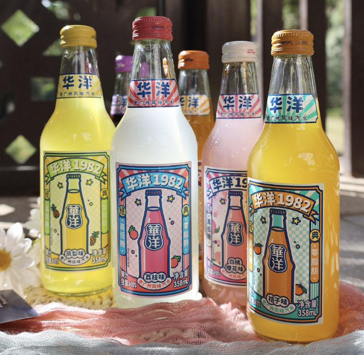 “武汉二厂”汽水借助的老牌国企二厂汽水的名号,主打情怀牌;华洋1982则主老广州风味汽水,包装上采用复古风格以吸引年轻消费者。