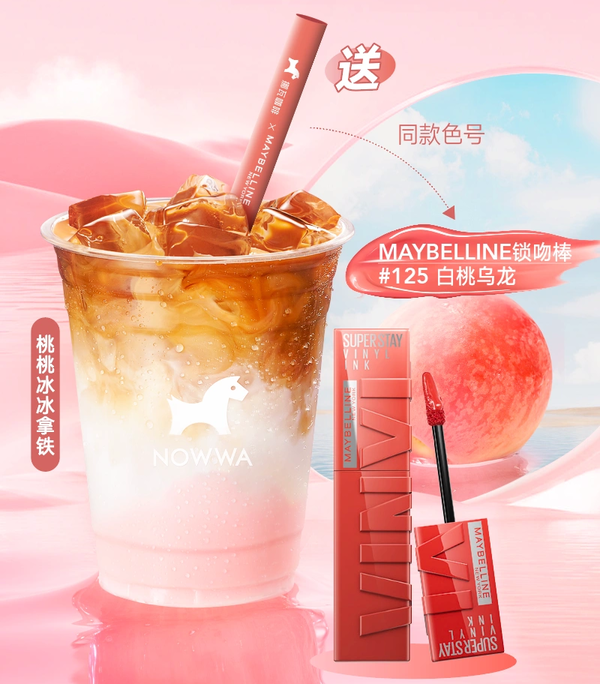 近日,NOWWA挪瓦咖啡推出美宝莲联名产品桃桃冰冰拿铁,并送上多重活动好礼。即日起截止8月22日,用户下单即可参与抽奖,赢得美宝莲“锁吻棒”唇釉#125 白桃乌龙;另外, 8月20日至22日期间,定制杯套买即赠。同时,下单「桃桃冰冰拿铁」,还可获赠同款色号联名“口红”吸管。(品牌官方)
