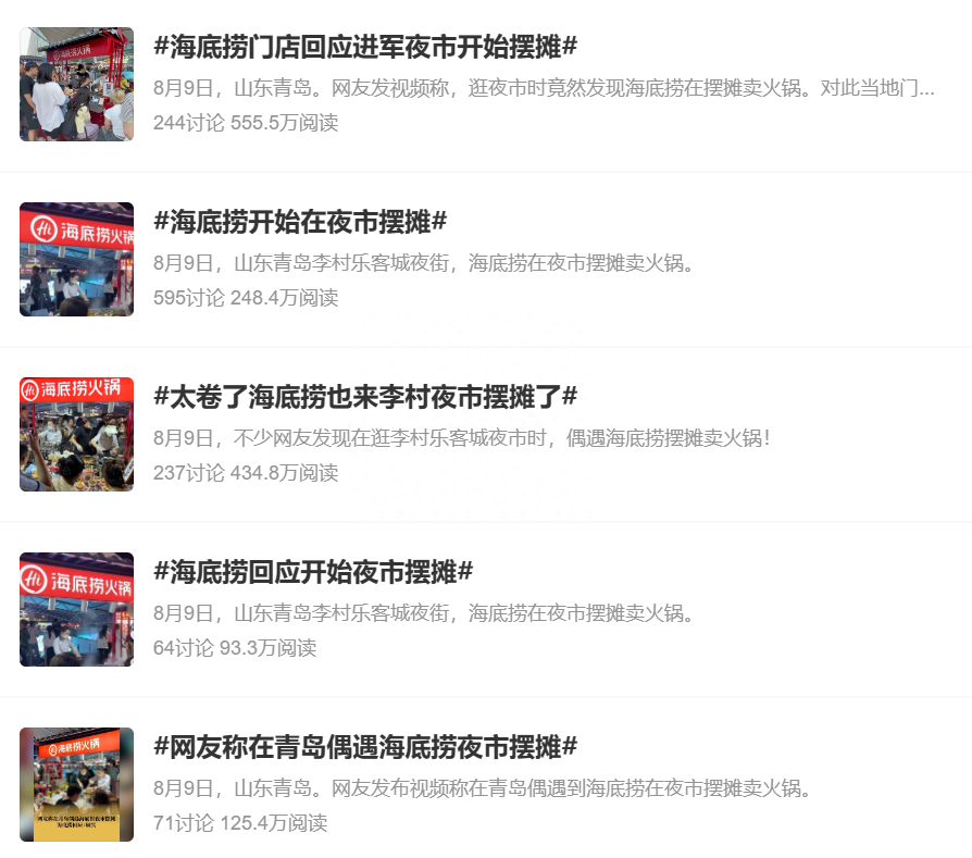 此次海底捞成功引发话题的关注度,最开始便是社交媒体平台上,用户主动分享其夜市摆摊的照片和视频。