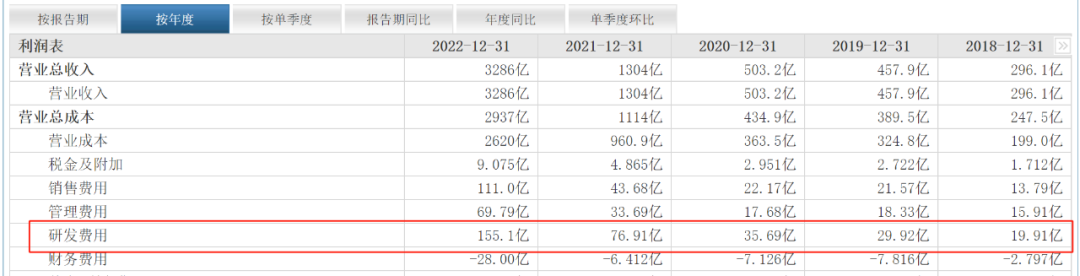 财报数据显示,今年上半年宁德时代的研发费用为98.5亿元,同比去年同期的57.68亿元猛增了70.77%。2022年宁德时代研发费用为155.1亿元,同比2021年的76.91亿元增长了101.66%。近5年中的前4年宁德时代的研发费用分别为19.91亿元、29.92亿元、35.69亿元和76.91亿元,同比增幅分别为22.01%、50.28%、19.29%和115.48%。研发费用增幅最低的2020年是19.29%,但依然有近20%的增幅。