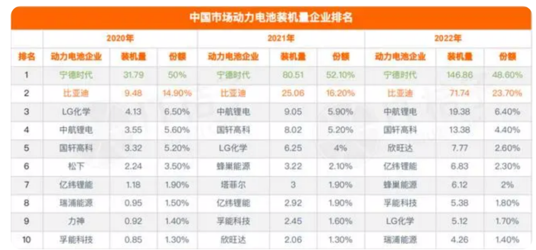 宁德时代因重心偏向海外,国内市场占有率有所下滑,由2020年的50%跌至2022年的48.6%。此消彼长,比亚迪市场份额由2020年的14.9%,增长至2022年的23.7%。两者市场份额差距也由35.1%缩减至24.9%。近期总销量突破500万辆的比亚迪凭借新能源汽车产品销量高速增长,带动了比亚迪动力电池装机量飙升,市场份额增长至30%以上,拉近了与宁德时代份额的差距。