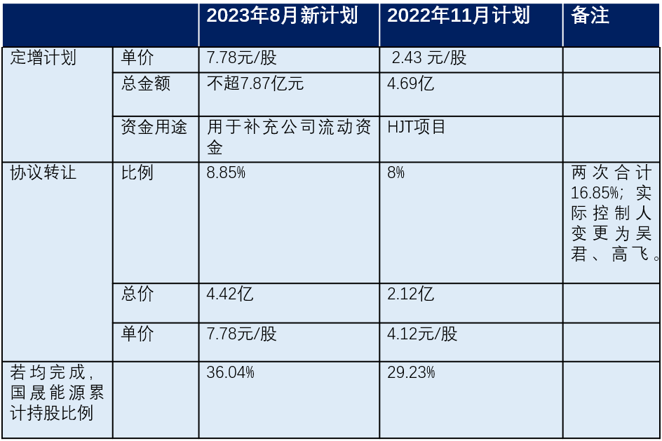 前后两个方案相同之处是,控股权还是转让给吴君、高飞控制的国晟能源;所不同的是他们二人付出的成本更高,获取公司控制权的时间节点也提前了。
