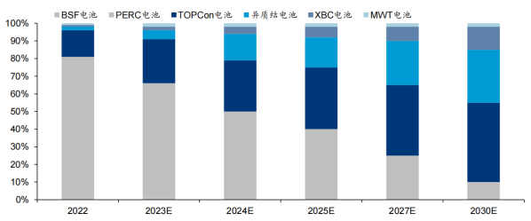 2022-2030年不同电池技术路线市场占比变化趋势预测图;资料来源:CPIA,华泰研究