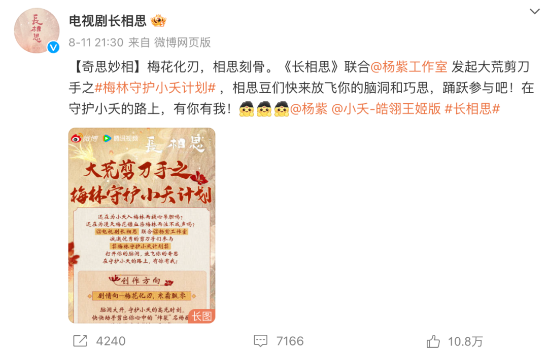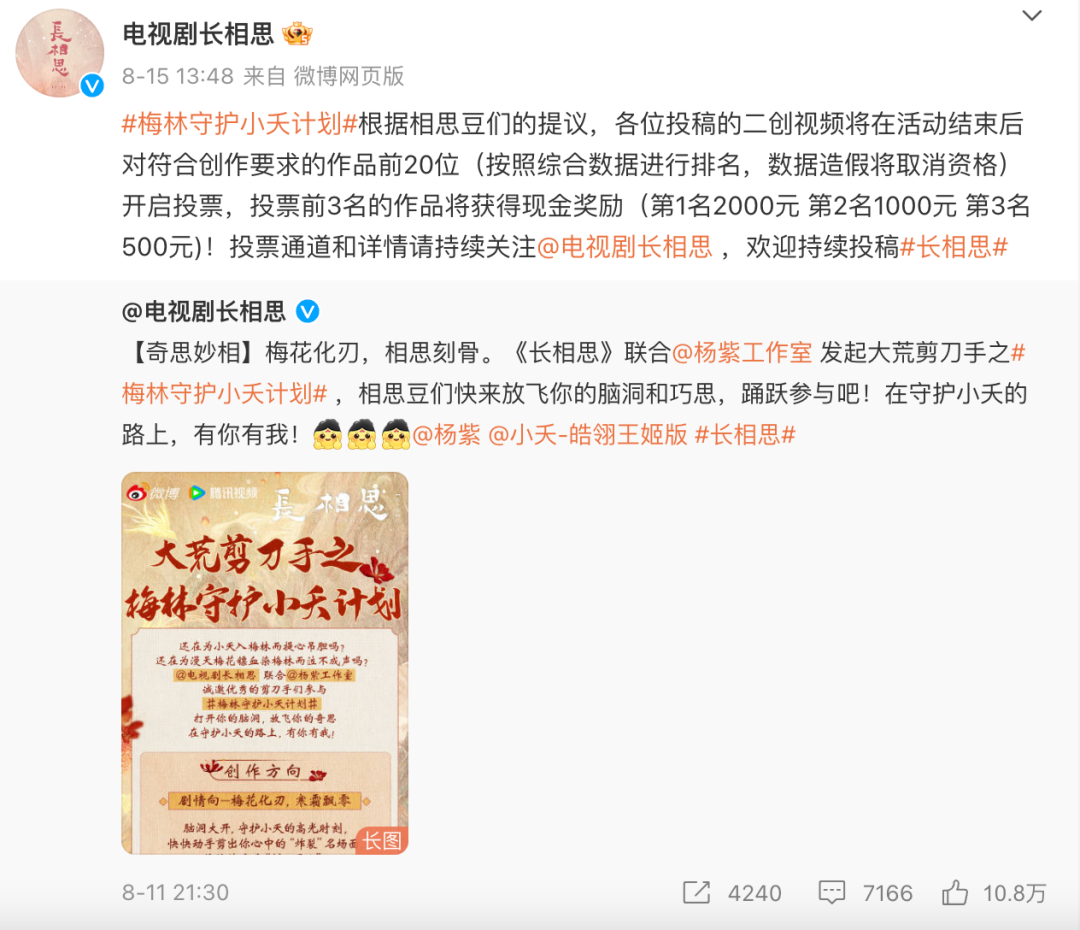 好在《长相思》够火,也能够吸引足够多优秀的剪刀手们入局。大结局点映后的第二天,《长相思》官方顺应用户提议,将对参与二创活动的视频进行投票评选,前三名分别获得2000元、1000元、500元的现金奖励。至此,这场看起来更像是一场以二创为名的剧集营销活动告一段落。