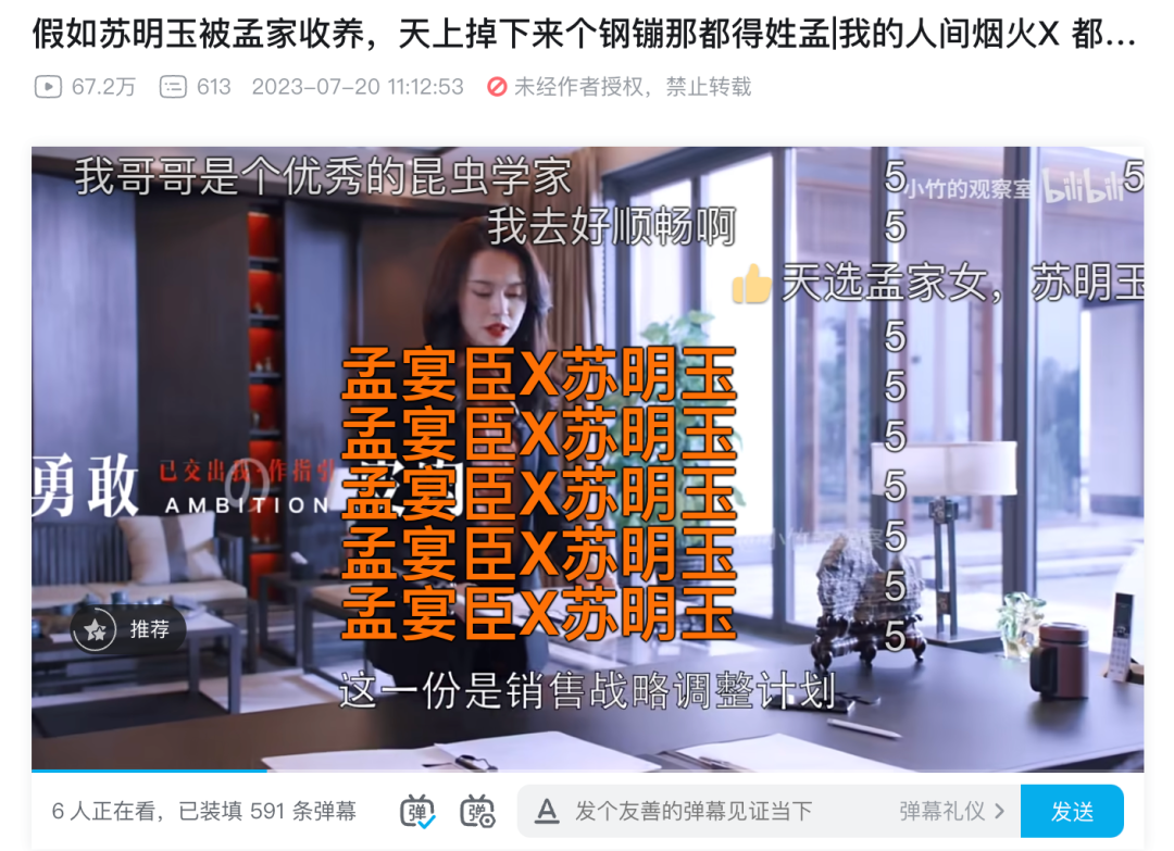 另一种重组剧情式二创则流行于“意难平”类剧集,尤其是与观众预想背道而驰的剧集,比如《我的人间烟火》。由于剧中男女主角人设观众难以理解,在B站上便涌现了大量观众自行选角重塑剧情的二创内容,比如以《都挺好》中的苏明玉、《狂飙》中的高启兰替代原剧中的许沁,打造观众心中的“孟式家族”。