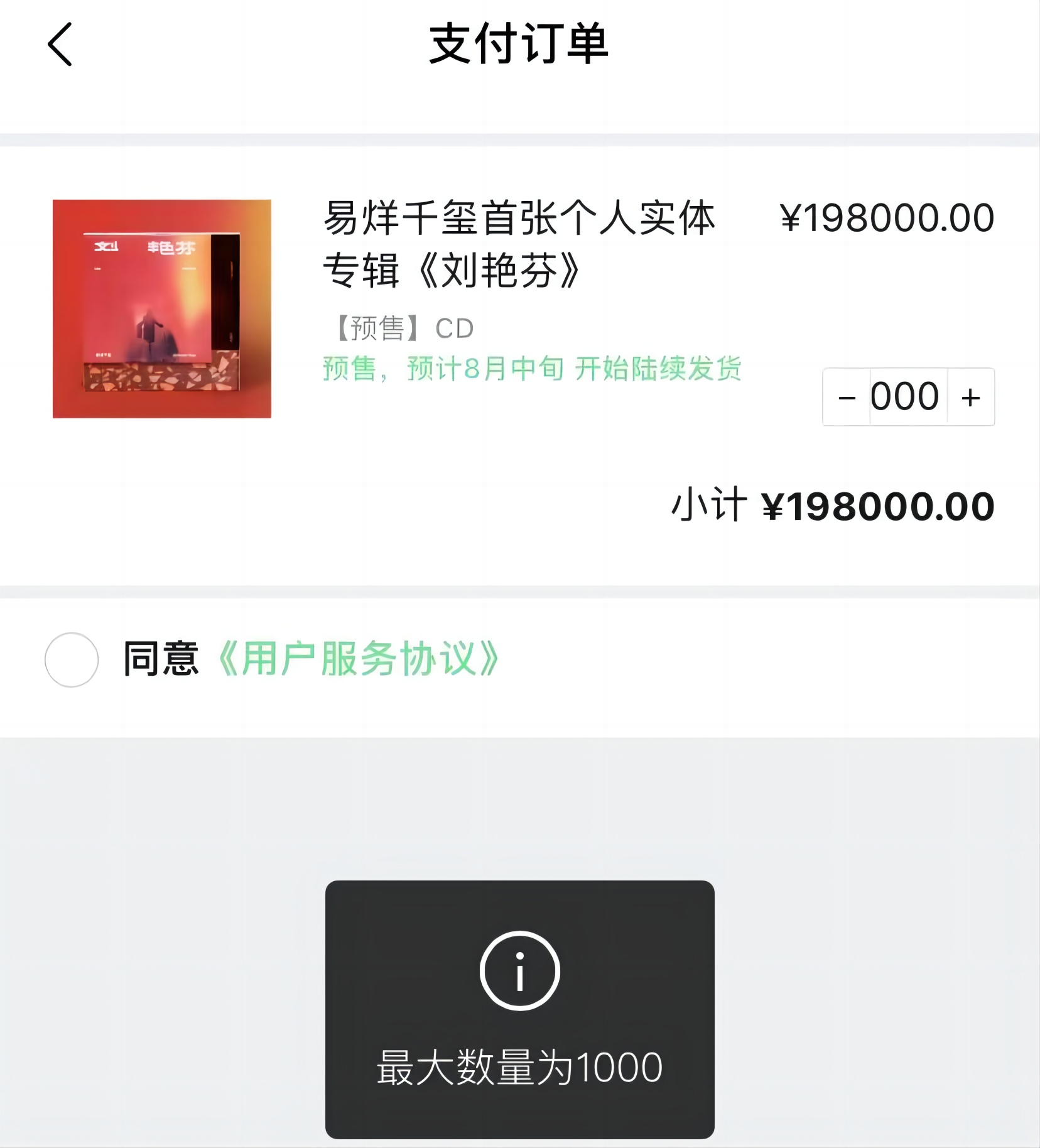 1、实体专辑本质是不限售的,如《刘艳芬》个人最大可以购买1000份,一个ID的最高消费金额,在理论上,可以达到198000元。