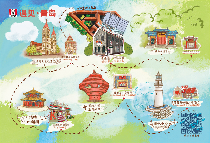 位于青岛百年里院的大鲍岛文化休闲街区是近代青岛民居的象征,凝聚着老青岛人的回忆,是青岛“红瓦绿树”城市风貌与特色城市肌理的重要构成元素。基于肯德基大鲍岛餐厅的开业,肯德基发起“遇见·青岛”肯德基网红餐厅打卡系列活动,从大鲍岛起始,途径中山路、栈桥、五四广场、情人坝和崂山,肯德基精选青岛六大特色景点,通过“遇见·青岛”主题有声明信片,以“美食+文旅”的跨界模式,带您走进这座城市,领略不一样的青岛风光和别具一格的肯德基网红餐厅,从百年里院出发,遇见青岛,遇见你。