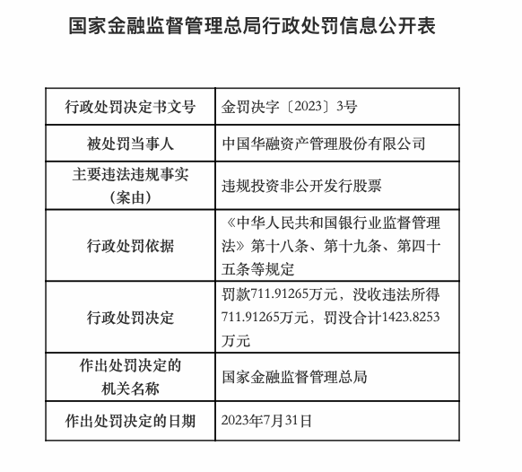 8月18日,国家金融监督管理总局行政处罚信息公开表显示,中国华融资产管理股份有限公司因违规投资非公开发行股票,被罚款711.91265万元,没收违法所得711.91265万元,罚没合计1423.8253万元