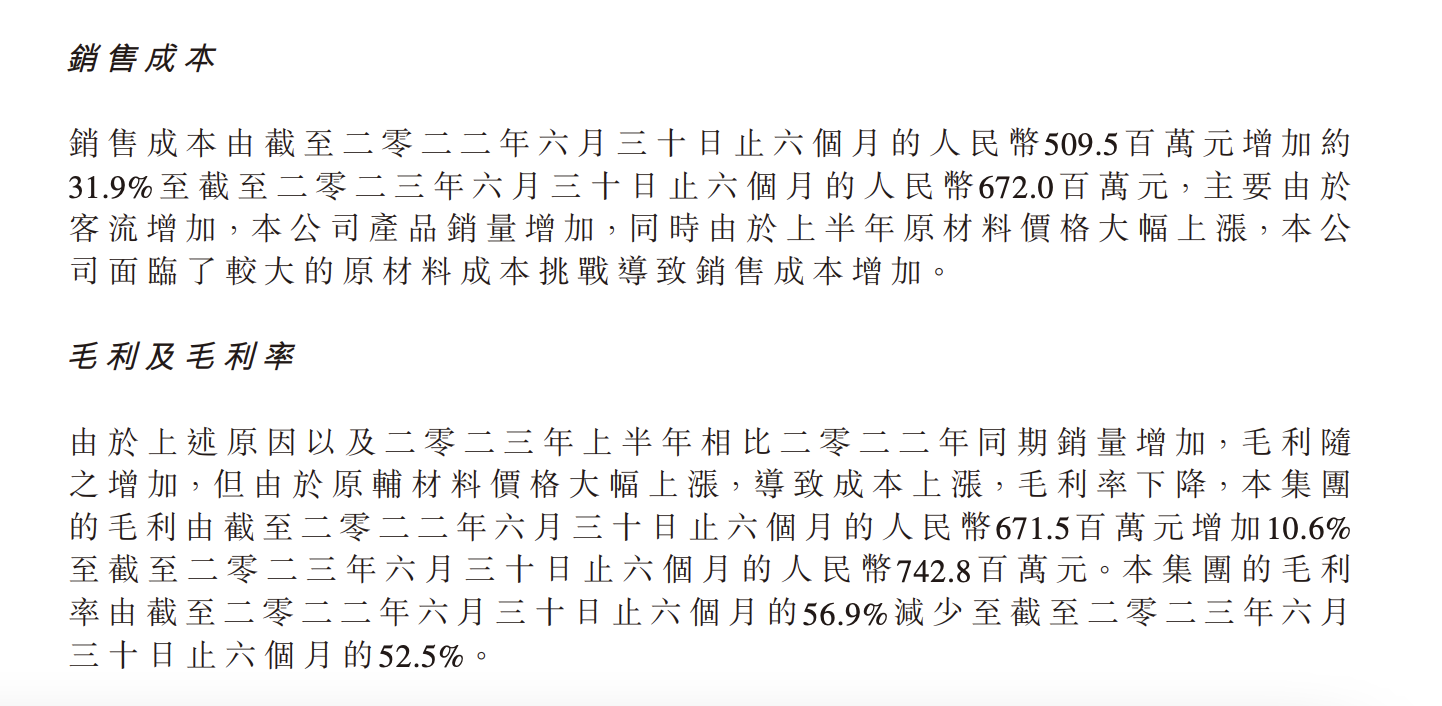 从财报数据来看,周黑鸭的销售成本由2022年的5.1亿元升至6.72亿元,上浮31.9%。毛利率则由去年同期的56.9%进一步下滑至52.5%。