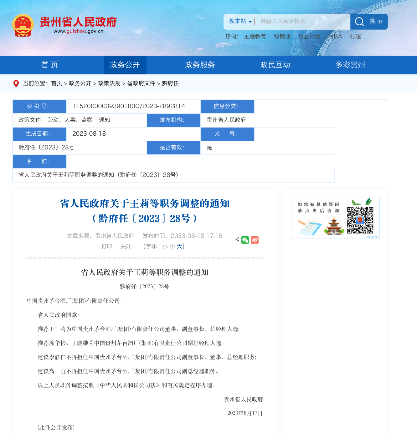 8月18日,据贵州省人民政府网站消息,省人民政府同意:推荐王莉为中国贵州茅台酒厂(集团)有限责任公司董事、副董事长、总经理人选;推荐涂华彬、王晓维为中国贵州茅台酒厂(集团)有限责任公司副总经理人选。建议李静仁不再担任中国贵州茅台酒厂(集团)有限责任公司副董事长、董事、总经理职务;建议高山不再担任中国贵州茅台酒厂(集团)有限责任公司副总经理职务。以上人员职务调整按照《中华人民共和国公司法》和有关规定程序办理。