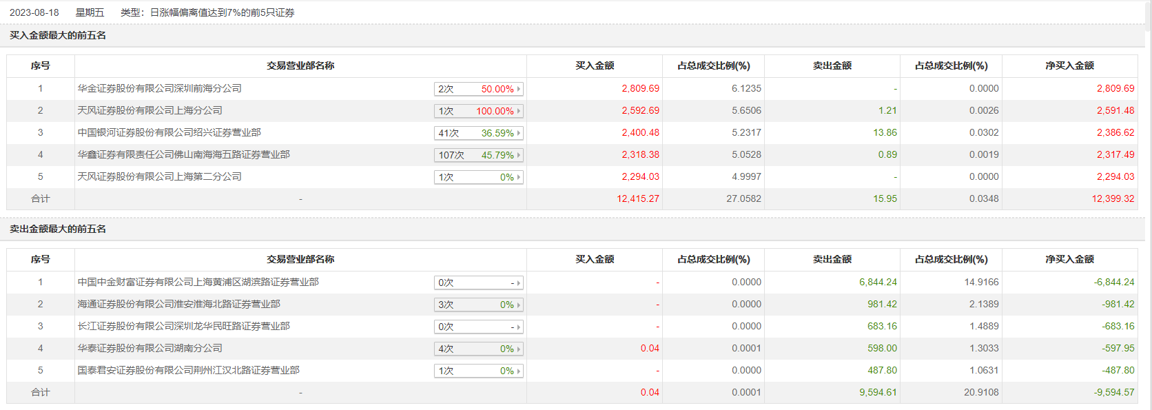 8月18日,中铁特货今日涨停,全天换手率达9.08%,振幅达10.56%。龙虎榜数据显示,营业部席位合计净买入2804.75万元。其中,华金证券深圳前海分公司、天风证券上海分公司分别买入2809.69万元、2592.69万元;中国中金财富证券有限公司上海黄浦区湖滨路证券营业部、海通证券淮安淮海北路证券营业部分别卖出6844.24万元、981.42万元。