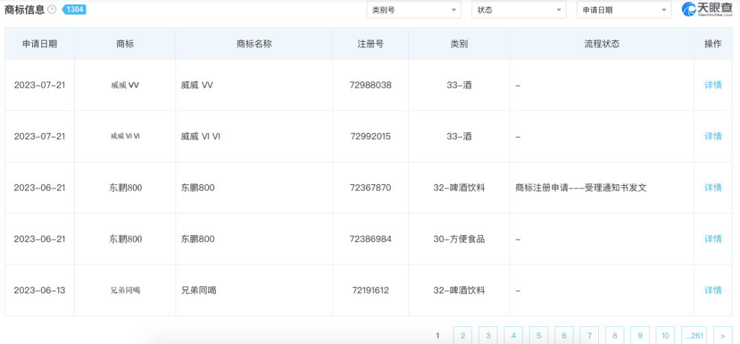 至于东鹏饮料,在“东鹏特饮”的功能饮料第一发展曲线外,将咖啡、电解质饮料视为第二发展曲线,同时用无糖茶等产品填充产品池。从天眼查的商标信息中,能够发现东鹏饮料在酒水、方便食品领域,也都有所布局。