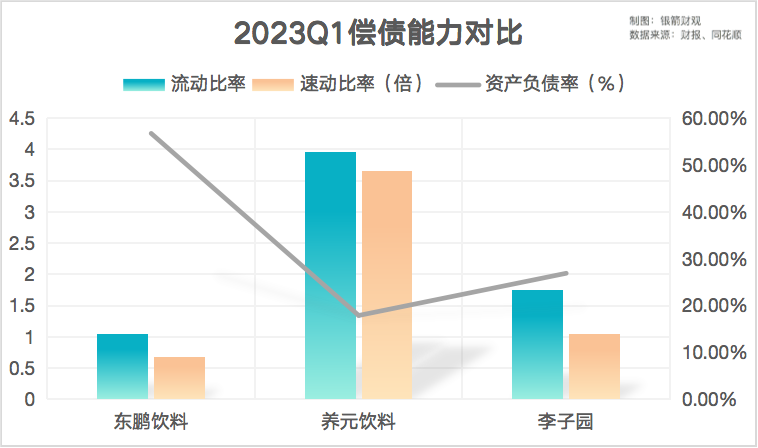 由于部分企业尚未发布2023年半年报,在此对比一季度主要饮料上市企业养元饮料、李子园的偿债能力相关数据,足以侧面展示东鹏饮料与行业平均水平的差异。