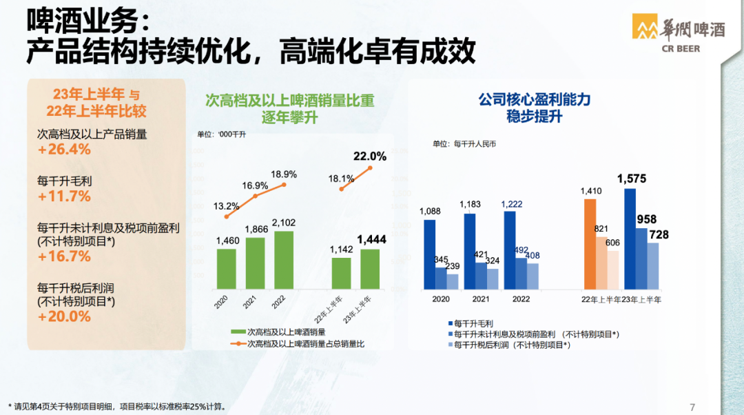具体来看,该集团上半年整体啤酒销量同比上升4.4%至约 6,571,000千升,平均销售价格同比上升4.4%。其中次高档及以上啤酒销量同比增长26.4%,达到约1,444,000千升。