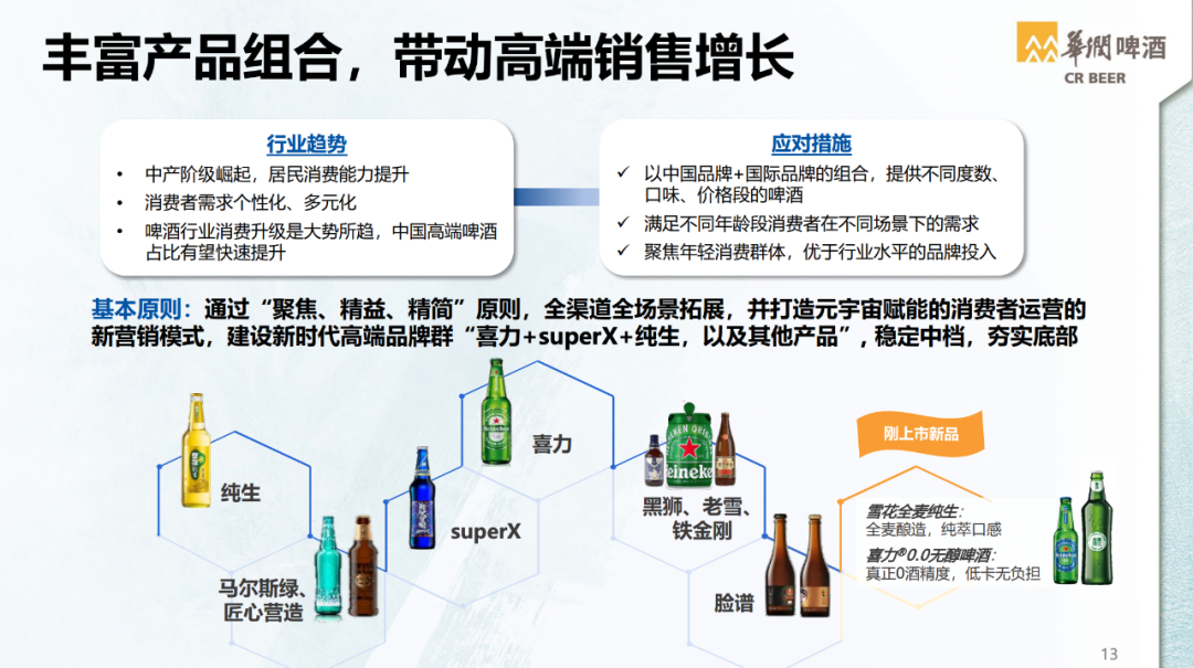 “这就使得我们对整个啤酒业务要两手抓,两手都要硬,就是一手要抓高端化,一手要抓经济型,夯实底部。”侯孝海说,“我们整体(高端化)打法没有太大调整,只是比过去更重视底部规模,但这并不更改公司进军高端化的主力方向。”