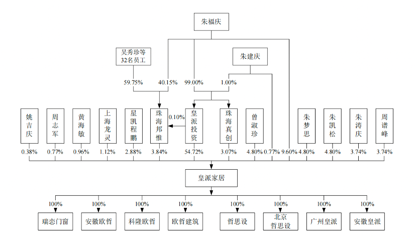 皇派投资是皇派家居的控股股东,占皇派家居股本总额的54.72%,其中,朱福庆持股99%,其弟朱建庆持股1%。与此同时,朱建庆直接及间接合计持有皇派家居1.35%的股份,并担任皇派家居董事、总经理。