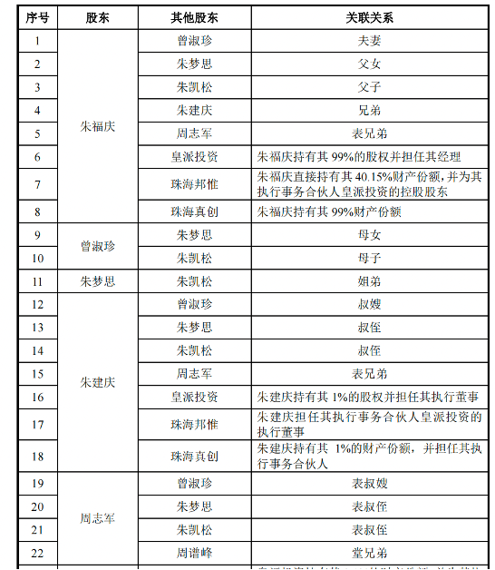 不仅如此,实际控制人朱福庆的直系亲属曾淑珍、朱凯松各持有皇派家居4.80%的股份,朱福庆与曾淑珍为夫妻关系,与朱凯松为父子关系。然而,皇派家居并未将曾淑珍、朱凯松列为共同实际控制人。