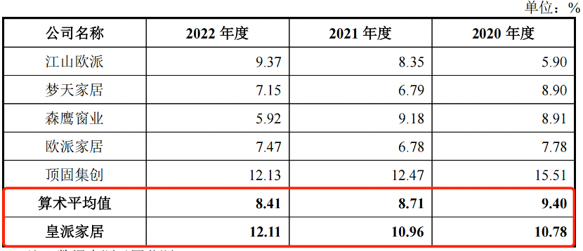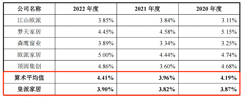 而皇派家居的同行可比上市公司的研发费用率的算数平均值分别为4.19%、3.96%、4.41%,皇派家居的研发费用率一直低于同行公司。
