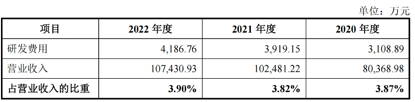 招股书显示,2020年-2022年(以下简称“报告期”),皇派家居的研发费用分别为3108.89万元、3919.15万元、4186.76万元,占当期营业收入的比例分别为3.87%、3.82%、3.90%。