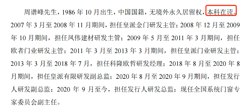 此外,上文提到的周谱峰是皇派家居的研发中心总监,学历为本科在读。