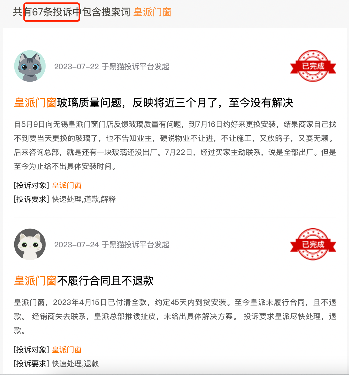 「子弹财经」注意到,黑猫投诉中,共有67条投诉涉及“皇派门窗”,包括质量问题、售后问题、违约等。