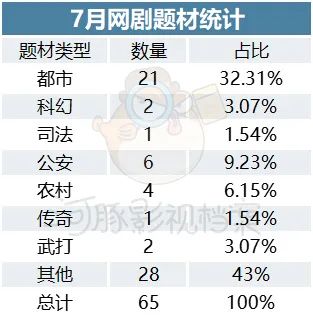 从题材来看,本月现实主义题材和悬疑题材剧集数量有所增长。都市题材21部,科幻题材2部,司法题材1部,公安题材6部,传奇题材1部,农村题材4部,武打题材2部,其他题材28部。