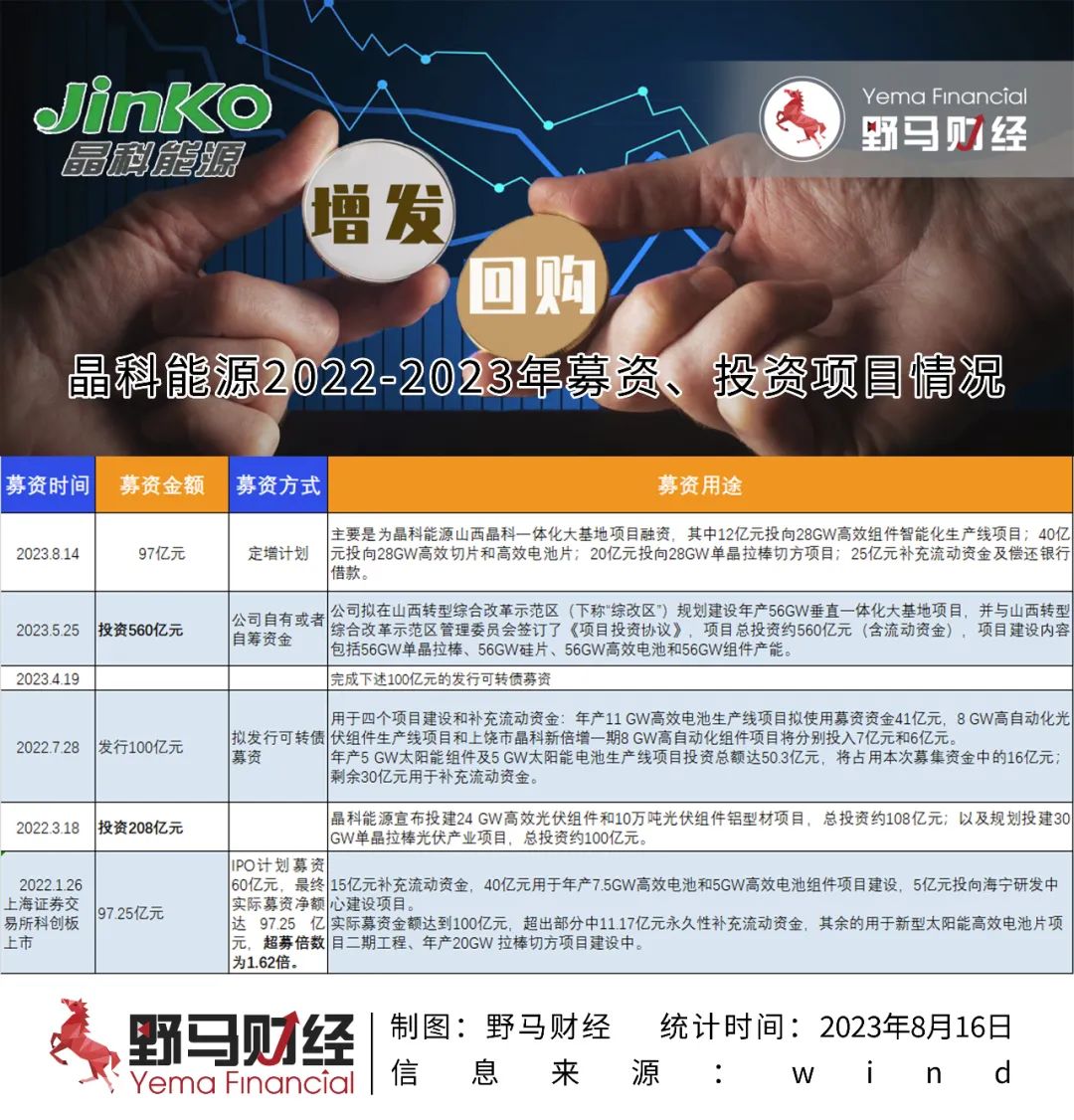 10个月后的2023年4月19日,晶科能源已经完成了上述100亿元的可转债募资。3个月后的2023年8月14日,晶科能源再次发布97亿元的定增计划。