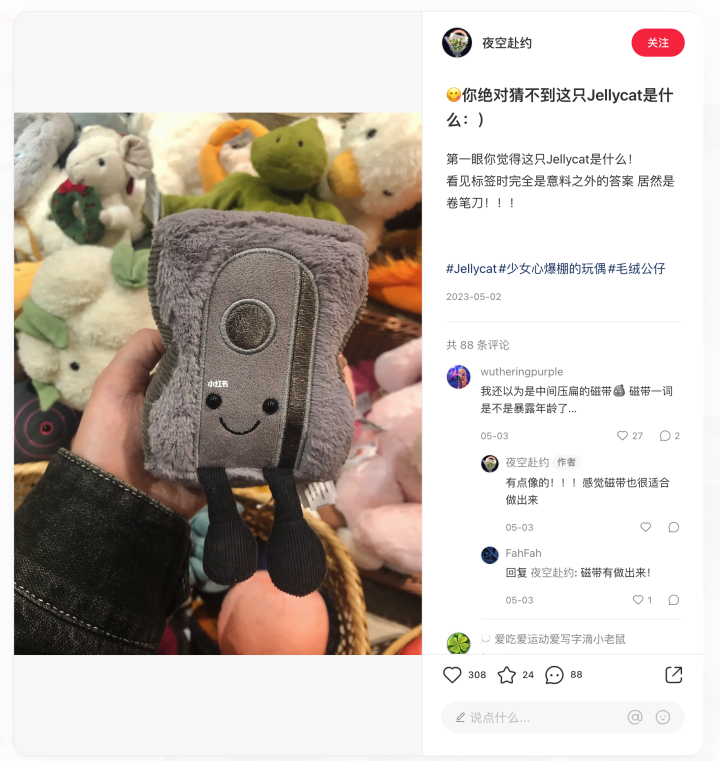 为什么jELLYCAT能够激发出大量二创内容?通过用户在小红书发布的笔记,大概能总结出几个要素。