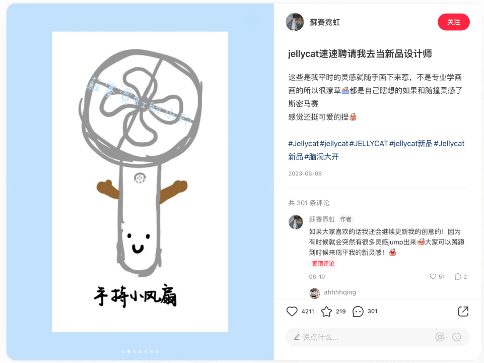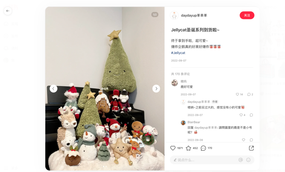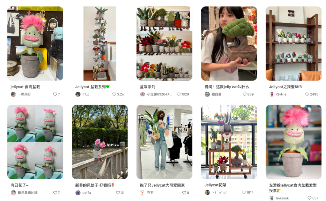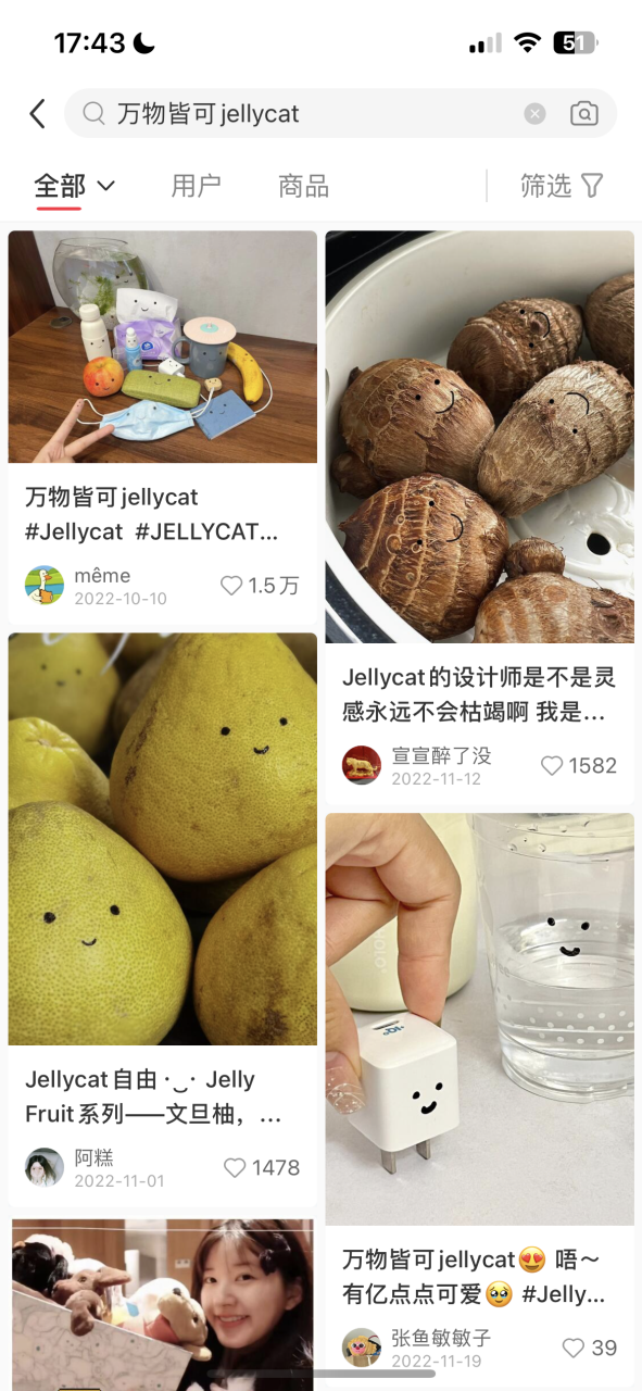 做到这一点,丰富、独特、有创意的产品设计是核心原因;用户基于此在社交媒体上进行的二度创作,则是jELLYCAT在中国走红的重要原因。