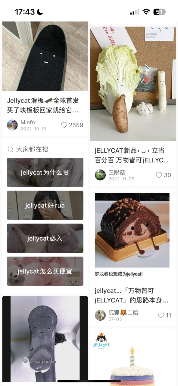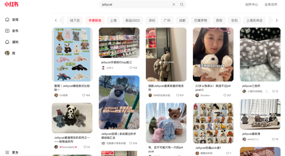 而柔软亲肤也是jELLYCAT的消费者强调的,在小红书搜索jELLYCAT,第一个关联的TAG就是「手感排名」。