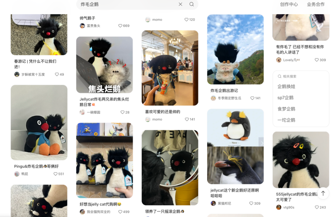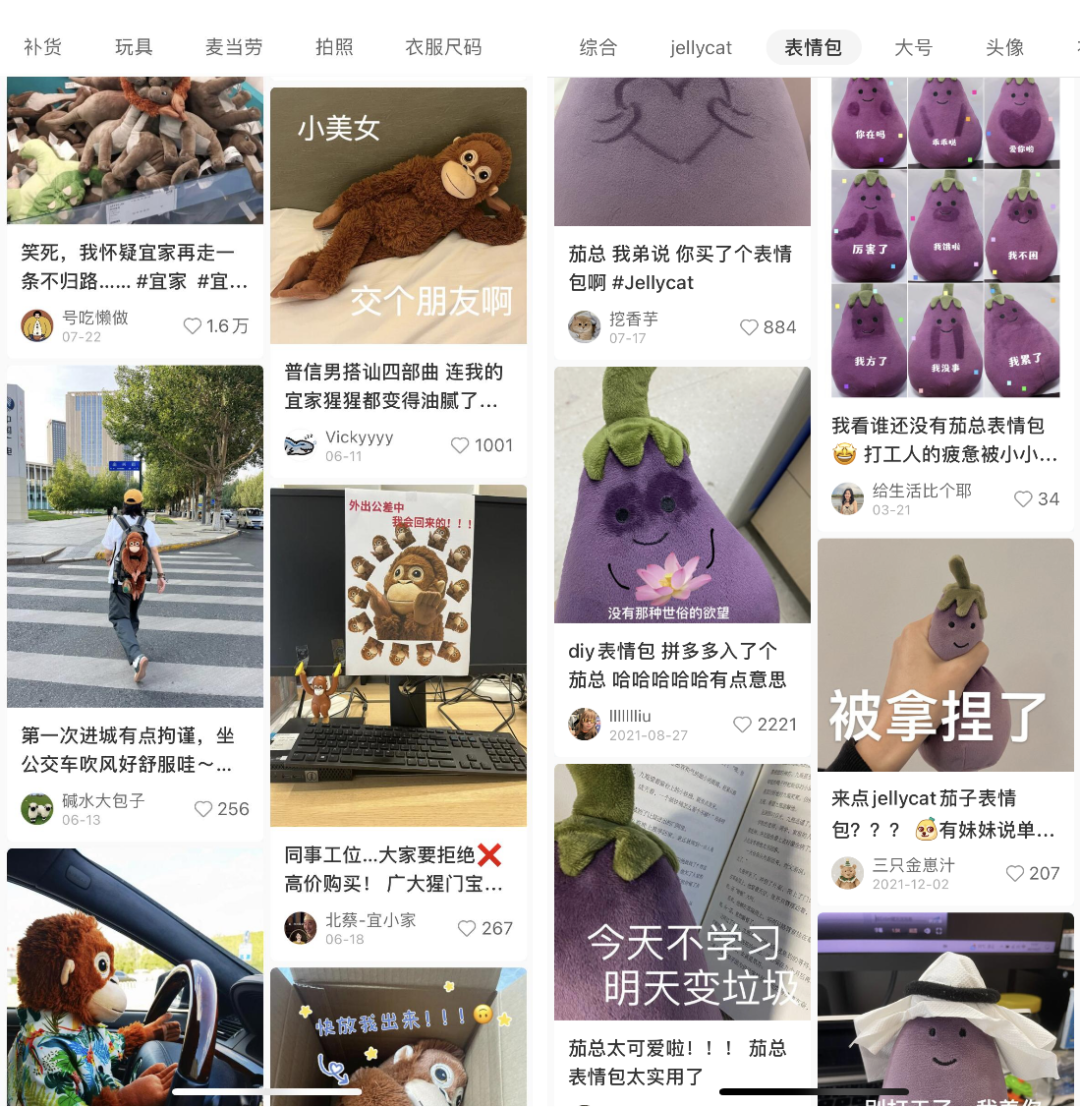 尤其是二创,很多用户在小红书发布了各种产品和品牌衍生的表情包和梗图。很多毛绒玩具的二创内容都是在小红书火起来的,这跟小红书的UGC属性和创作门槛低有关。