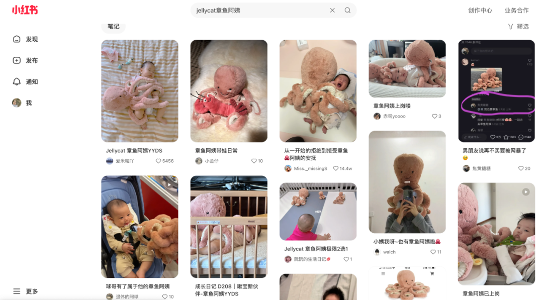 比如,jELLYCAT很多动物毛绒的腿部填充量较少,用户更容易摆弄,赋予产品不同的姿势。小红书上就有一群妈妈把一只大号章鱼当作安抚玩具,因为大章鱼的触角多、长且重量小,妈妈能用不同方式缠绕婴儿,给予安全感。这只大章鱼也因此被用户叫作「章鱼阿姨」。