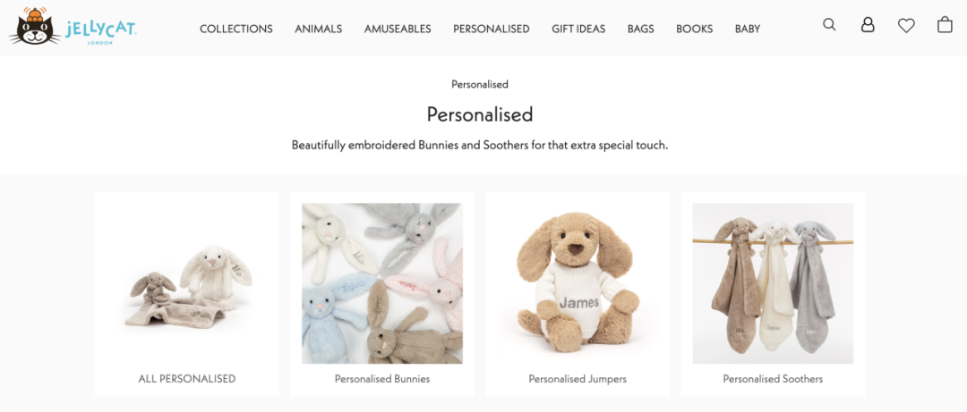 jELLYCAT还提供礼品相关的服务。比如礼物个性化定制,包括在邦尼兔耳朵或安抚巾印名字、定制带名字的毛绒毛衣,还可以帮用户写贺卡、去掉定价单。