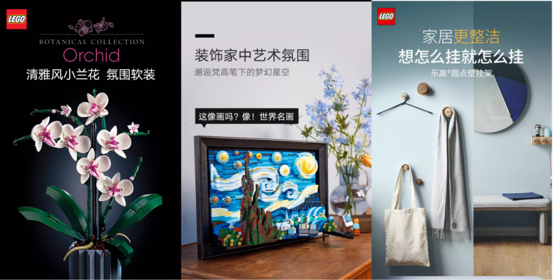 乐高2020年推出的积木花系列、2022年开始推出的名画系列和原点壁挂架就是体现。今年,乐高还分别在上海的静安嘉里中心和MOHO打造了「乐高灵感家装店」,用乐高的积木产品打造出不同风格的家居生活场景。