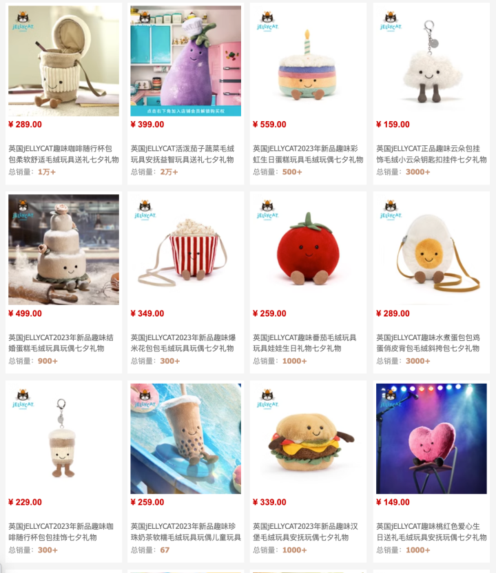 jELLYCAT是1999年在英国伦敦创立的毛绒玩具公司,创始人是William Gatacre和Thomas Gatacre两兄弟,品牌名字来自Thomas儿子的呓语。2013年,jELLYCAT进驻中国市场,2015年正式上线天猫国际旗舰店,在过去几年不仅销量大涨,社交媒体也有大量自来水内容,是很多毛绒玩具品牌的研究对象。