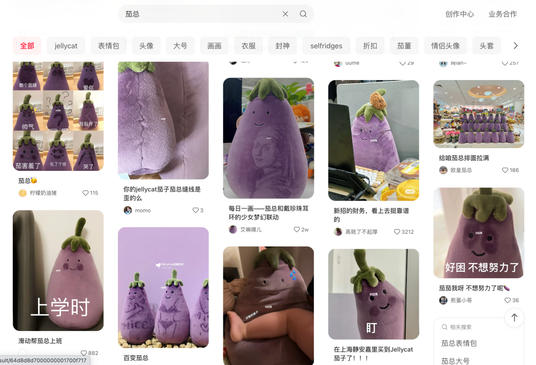 jELLYCAT「活泼茄子」是目前小红书上最受欢迎的二创素材,被大家尊称为「茄总」,它也是除邦尼兔和巴塞罗熊外在中国市场最受欢迎的产品。