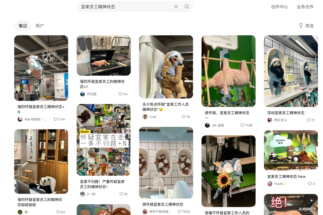 今年夏天小红书上就有很多用户上传宜家毛绒荒诞的陈列方式,比如泡澡的猩猩、烤炉上的猪、在办公区办公的鲨鱼和熊猫,并配文「怀疑宜家员工的精神状态」。这一陈列模式最早是宜家员工无心之举,被很多用户上传到小红书后,他们就主动复制,将毛绒融入到各个家居场景中。