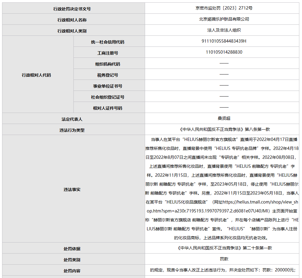 近日,HELIUS赫丽尔斯的关联公司北京婼薇乐护肤品有限公司,因在直播间背景及网店页面宣传“专研抗老”,但其实际产品并无抗老功效,涉嫌违反“反不正当竞争法”的相关规定,被北京市密云区市场监督管理局罚款20万元。