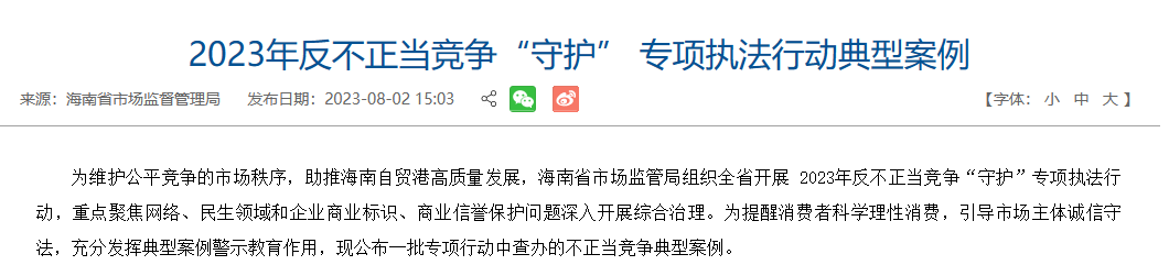 该公告的末尾写到,海南省市场监管部门将持续依法严厉打击仿冒混淆、虚假宣传等不正当竞争行为,着力维护公平竞争市场秩序。