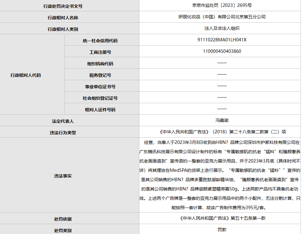 就在赫丽尔斯被罚的前几天,妍丽化妆品(中国)有限公司北京第五分公司因门店售卖的HBN品牌两款商品,因涉及“抗老”宣传违反了《广告法》,被北京市场监督管理局罚款。