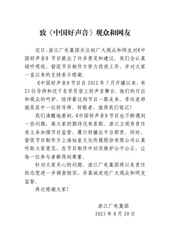 8月20日,浙江广电集团发文回应《中国好声音》争议,称针对大家关心的问题,将进一步调查核实。浙江广电集团表示,“我们清醒地看到,《中国好声音》节目也不断遇到一些问题,离大家的期待还有差距。浙江卫视有责任有义务加强节目监管,履行好播出平台职责。同时,督促节目制作方上海灿星文化传媒股份有限公司认真听取大家意见,在节目制作中切实维护公平公正,让每一位参与者都得到尊重。”