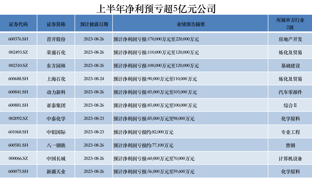 11家公司预计亏损金额至少超过5亿元。其中首开股份(600376.SH)、荣盛石化(002493.SZ)、东方园林(002310.SZ)3家亏损超10亿元。