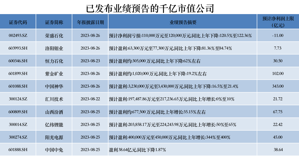本周披露半年报的千亿市值公司有33家,其中10家已提前披露了业绩预告或快报。受行业环境影响,各龙头企业表现分化,如光伏逆变器龙头阳光电源(300274.SZ)业绩实现超高增长达3倍~4倍;锂电池龙头亿纬锂能(300014.SZ)最高预增50%;煤炭巨头中国神华(601088.SH)则业绩下滑。