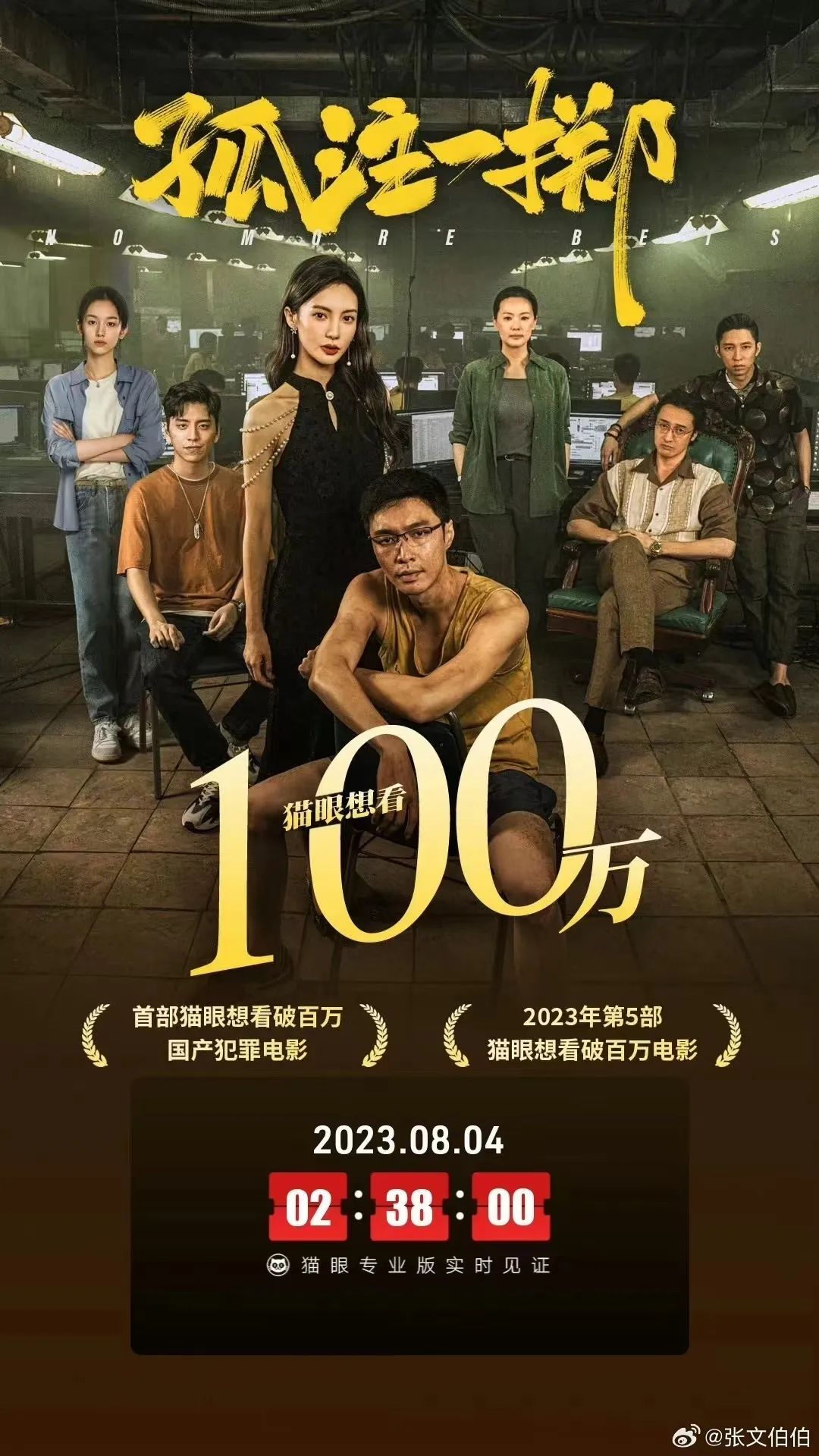 点映前一天,《孤注一掷》的营销操盘手——伯乐营销CEO张文伯在微博晒出了猫眼想看人数破百万的海报,并称“是在一个较短的时间周期内,在没有平台更多运营资源支持的情况下”达成。