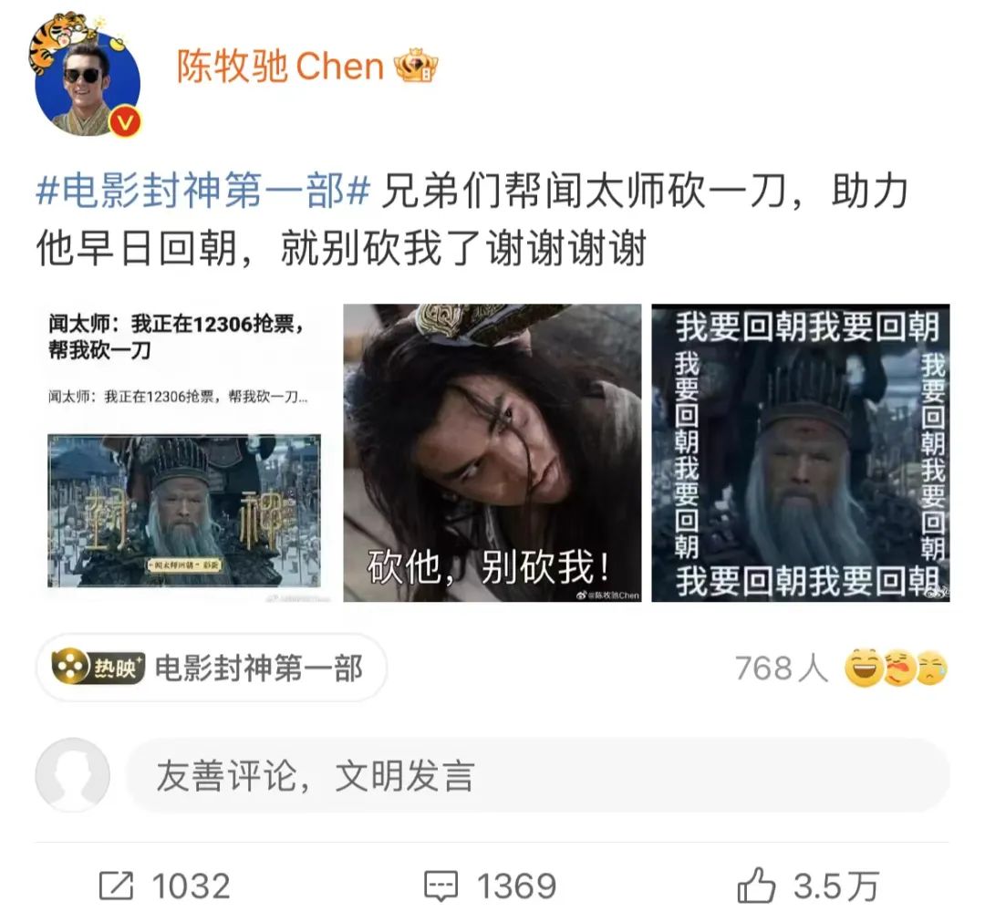 比如,闻太师回朝的彩蛋勾起了很多观众看第二部的欲望,于是片方在各个平台发布了这段视频。当时,惨淡的票房很可能让第二、三部流产,让闻太师回不了朝。有位豆瓣网友替闻太师发帖:我在12306抢票,帮我砍一刀。帖子发布没多久,主演之一陈牧驰便在自己微博上转发了截图。“助力闻太师回朝”成为《封神》的第一个出圈梗,并引发了网友的P图风潮。