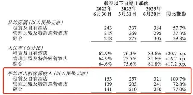 这番操作下来,回血的效果也的确显著。据坐拥汉庭、桔子、全季酒店的华住集团披露的运营数据显示,今年第二季度,华住中国的RevPAR(平均可出租客房收入)大幅回升至2019年水平的121%,背后正是得益于强劲的旅游需求支撑,以及日均房价上涨的推动。