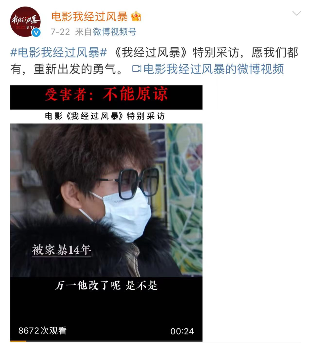 除了一二线城市,秦海燕还去了县城和农村,采访了受害者、反家暴组织、基层干警和律师等,积累了数百个真实案例之后,产生了一种使命感,她形容那是一种“感其所感,伤其所伤,痛其所痛”的情绪。“我设想过可能会有很多声音说这是蹭女性主义的话题,讨论被带偏到男女对立或者恐婚恐育,但我的初心就很坚定,就是想要让这个问题被看到、被解决,想让大家倾听和了解家暴的受害者们,理性地探讨这个问题。”