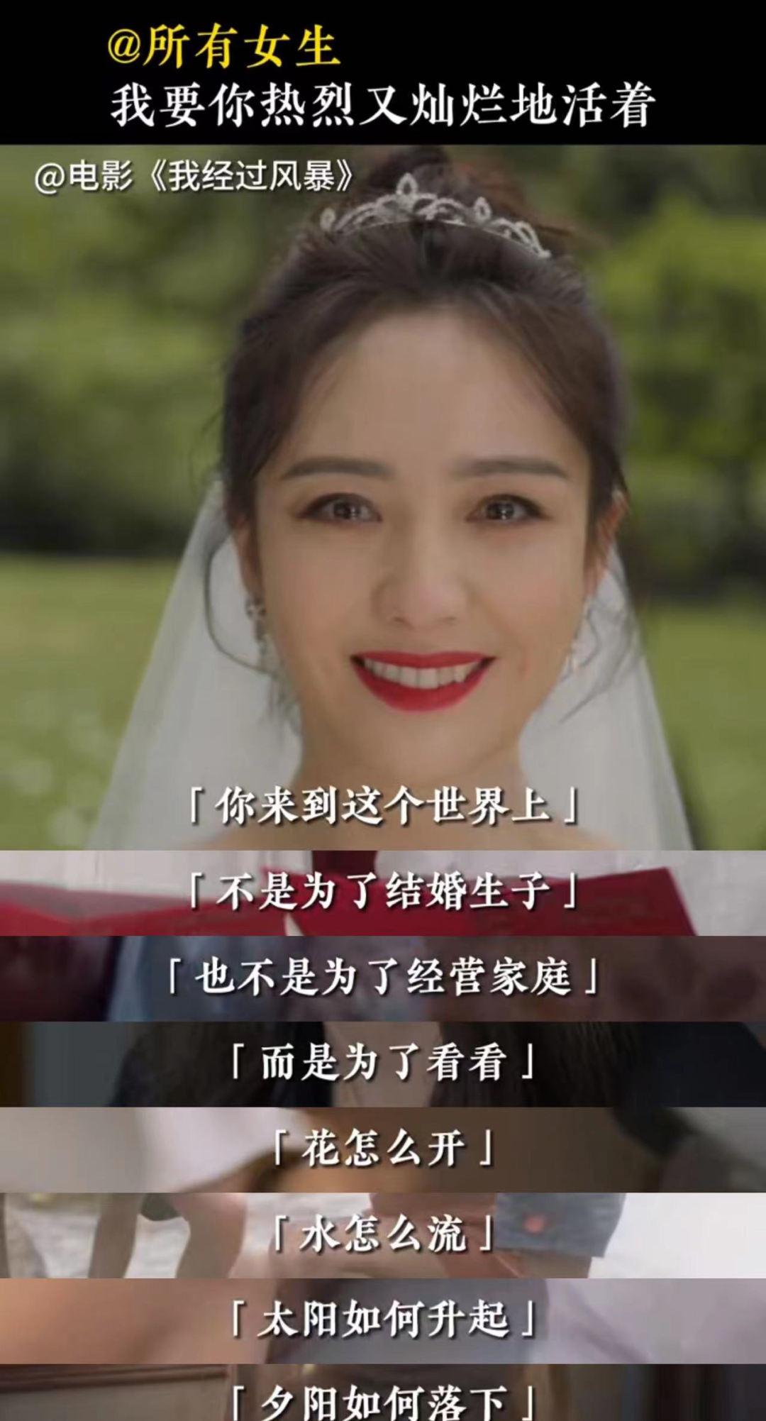 “我向往的女性她们选择成为作家、艺术家、科学家,以这些身份挖掘 、塑造自己的潜能,实现人类各种伟大的可能性。她们每一次面临她们可以躲在性别的洞穴里就可以逃避风暴的时候,她们没有选择逃避,她们挺身而出,对自己赌咒发誓,我要做得更出色,更完美。这一次真付出行动,这一次我竭尽所能。”